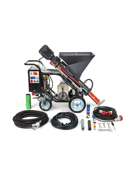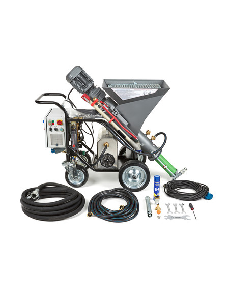 Штукатурная станция Stirex PS220 предназначена для приготовления отделочных растворов из сухих строительных смесей, их транспортировки и последующего нанесения под давлением на вертикальные или горизонтальные рабочие поверхности. Установка работает от бытовой электросети 220 В и имеет компактные размеры. Она оборудована мощным редуктором немецкого производства и надежным безмасляным мембранным компрессором.